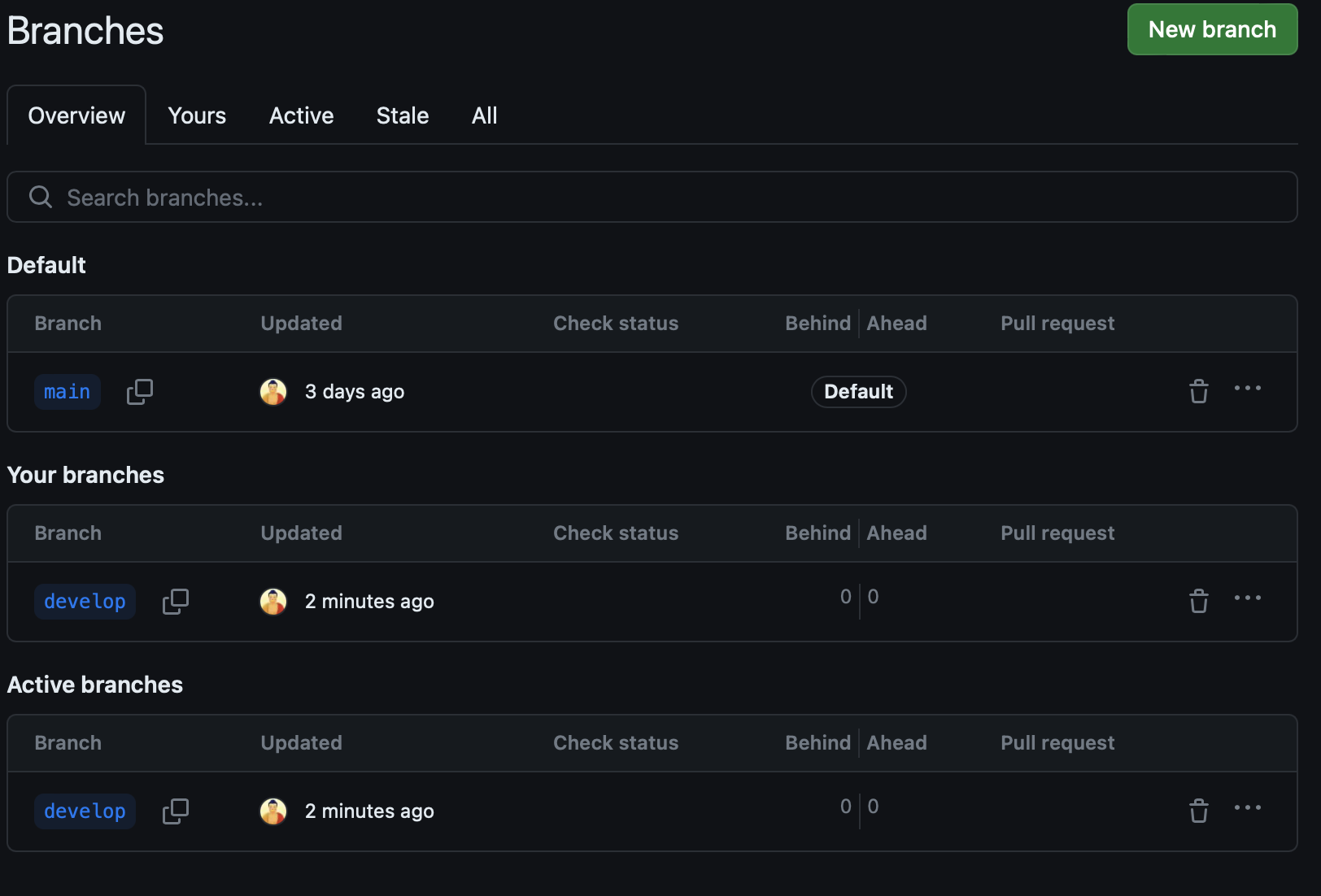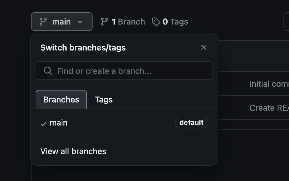 아래 화면에서 View all branches 를 클릭 -> New branch 클릭 -> 이름(develop) 입력 후 Create new brabch 클릭
