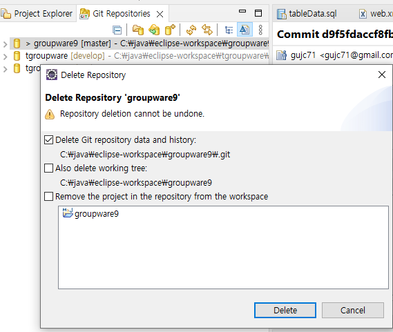 메뉴 > Window > Show View > Other > Git Repositories > 오른쪽 마우스 클릭 > Delete Repository...