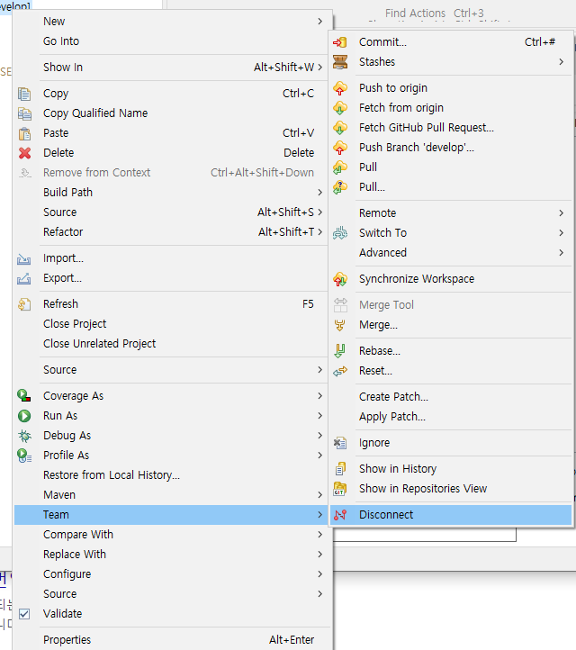 Project Explorer > 프로젝트 우클릭 > Team > Disconnect 선택.